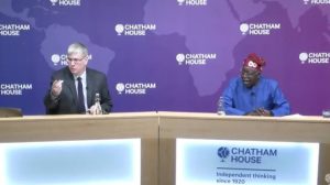 Presidential Candidate of the All Progressives Congress Asiwaju, Bola Ahmed Tinubu, on Monday addressed Chatham House in London ahead of Nigeria’s presidential election in February next year.