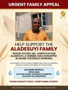 Another victim, Joseph Aladesuyi, the Secretary of Okeluju Local Council Development Area in Akoko North West, was also abducted at a farm in the Kajola axis by about ten armed men who reportedly fired into the air before dragging him away despite resistance that left him wounded in the hand.